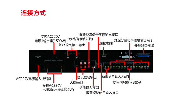 ■ 外控2台功放电源输出,2路最大1000W,6个分区输出,每个分区≤500W;