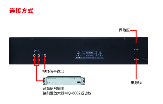1路音频信号左右声道(L/R)输出,音质清晰优美,1路视频信号输出。