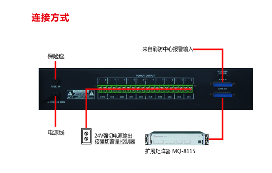 十路受报警控制的24V直流电源输出,可扩展到120个分区