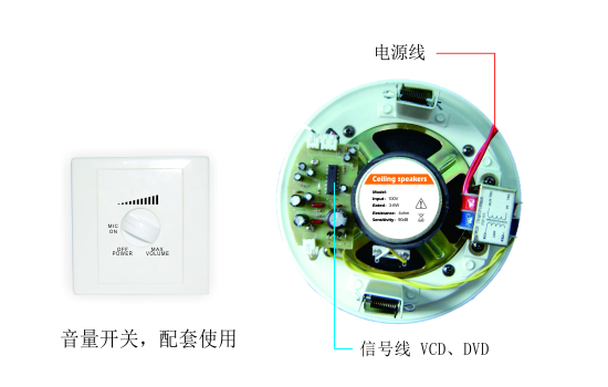 MQ-301,属5寸喇叭单元,ABS塑料,带音量可调节,带功放有源天花喇叭